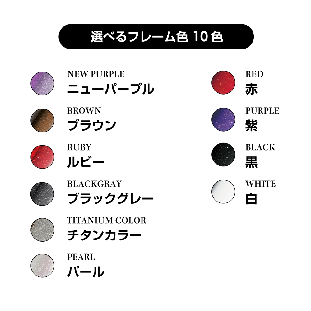 フレームカラー:10種類 (ニューパープル、ブラウン、ルビー、ブラックグレー、チタンカラー、パール、赤、紫、黒、白)