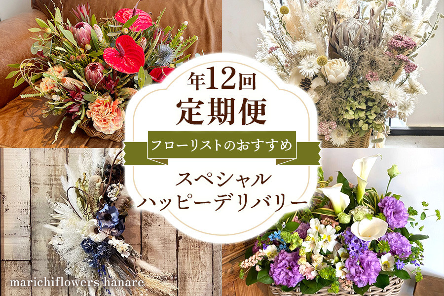 marichiflowersハナレのフローリストがおすすめする旬のお花を使った生花アレンジメントまたはドライフラワー作品を年12回に分けてランダムでお届けする定期便です!