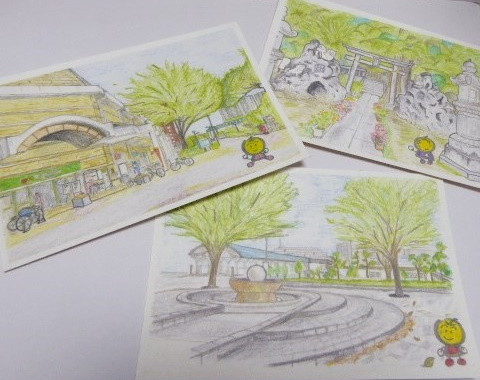 白井市内の6ヵ所を、スケッチした絵はがきです。マスコットキャラクター“なし坊ファミリー”も一緒に描かれています。