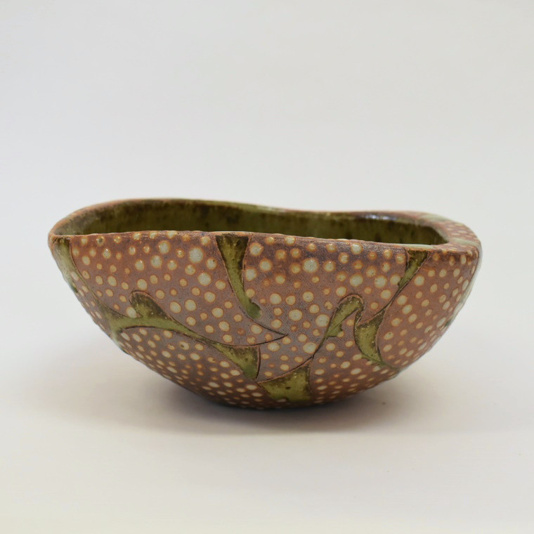 木の灰をメインにした灰釉が醸し出す緑の濃淡が印象的で、外側に施したドット柄が映える器です。