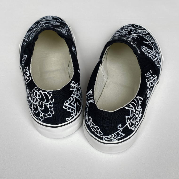 履くだけで気分が上がる♪ 世界で一足あなただけのスリッポン! 手描きスニーカー「ミュルクBB」黒地 総柄 幾何学模様 ワイズ 2E 22.0~28.0cm【受注制作】