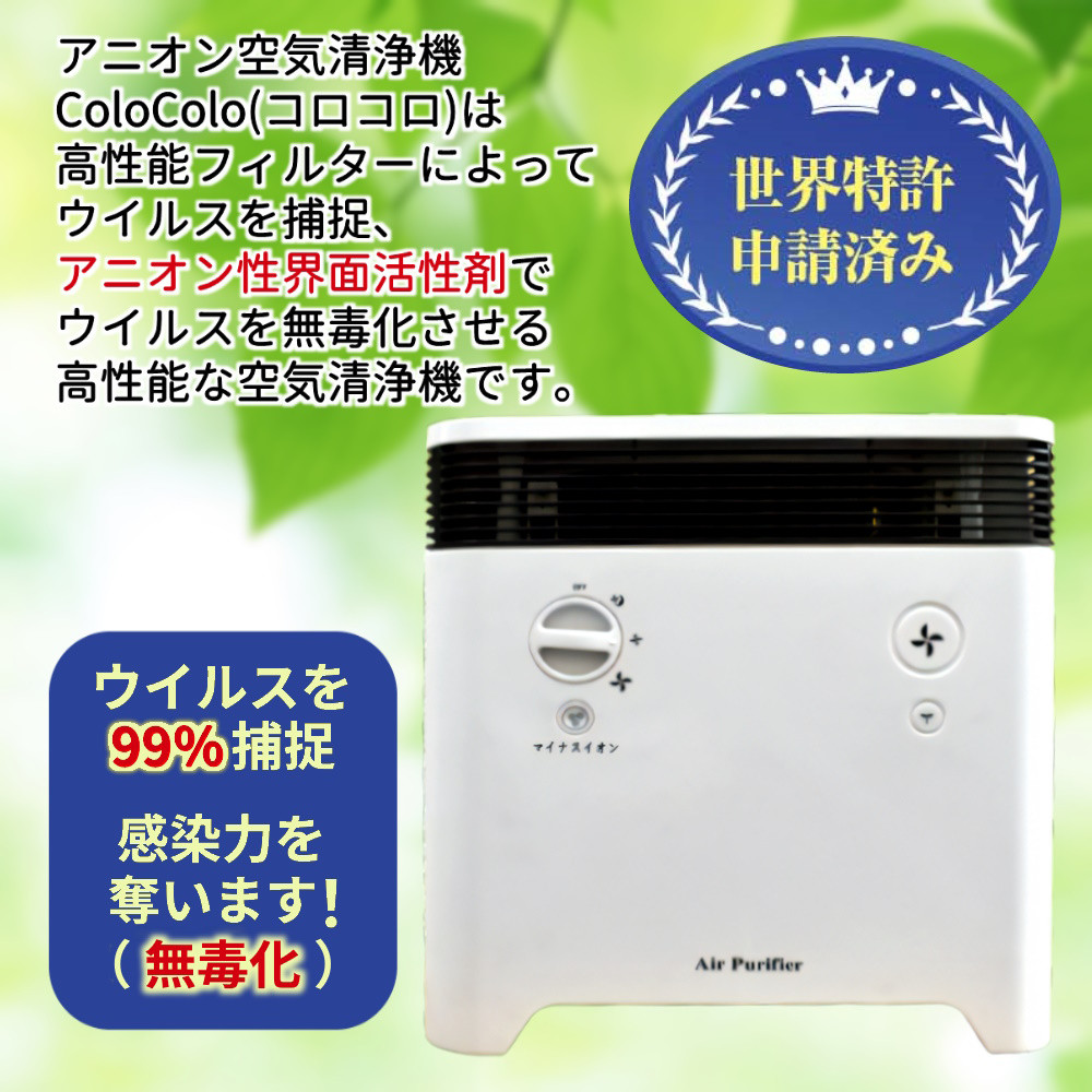 アニオン空気清浄機コロコロのフィルターには、ウイルスを電着させ破壊する陰イオン性界面活性剤(直鎖アルキルベンゼンスルホン酸ナトリウム*)を付着しており、ウイルスだけでなく空気中の粉塵や花粉・PM2.5をも99%捕捉します。