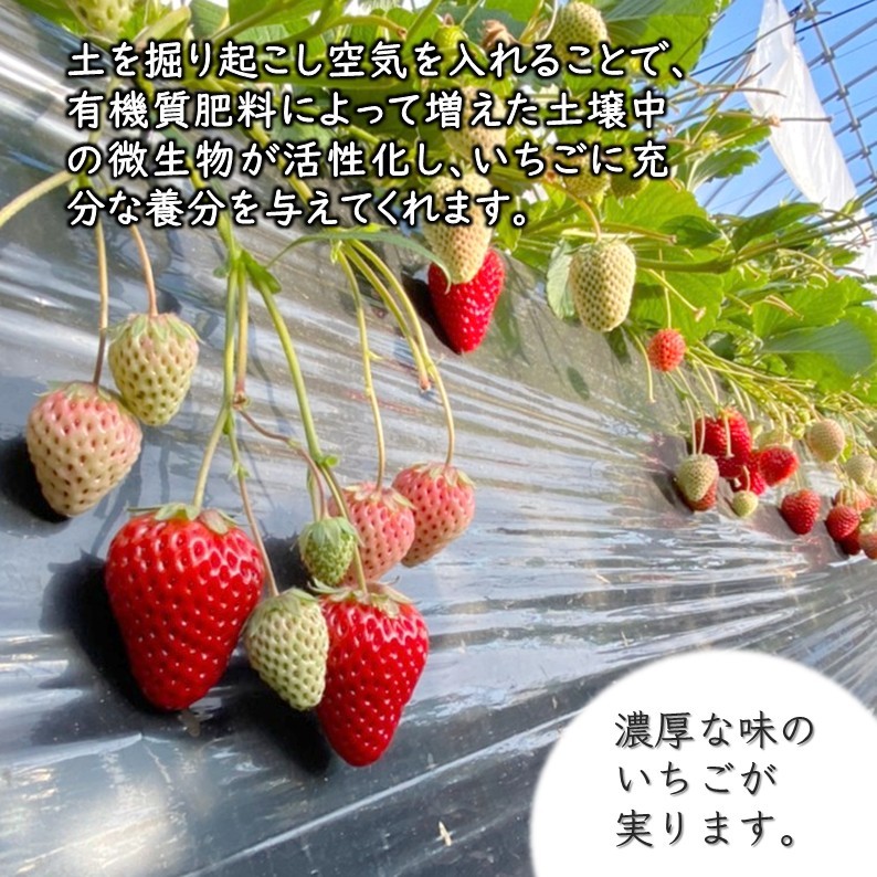 土づくりに力を入れて、いちごを育てています。関東ローム層という果物栽培に適した土壌に、さらに熟成された良質な堆肥と厳選した数種類の動植物性有機質肥料を施しています。