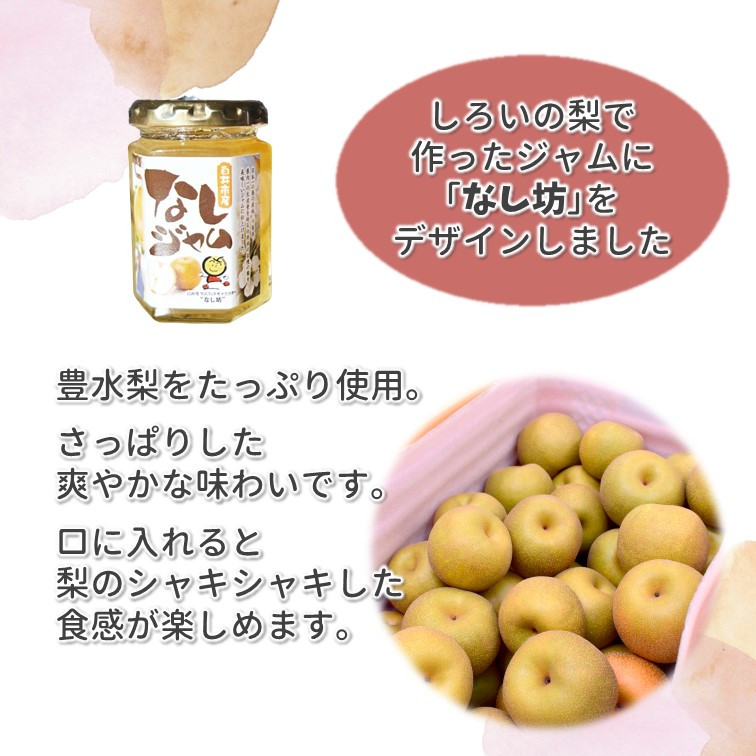 ジャムは白井市で収穫した豊水梨をたっぷりと使用し、さっぱりした味に仕上がっています。