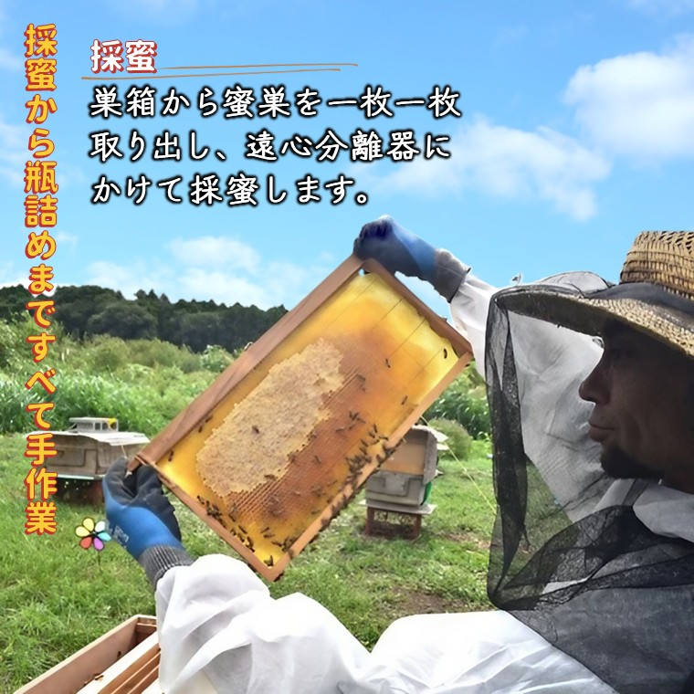 はちみつを巣箱から採取し、瓶詰めまでをその日のうちに手作業で行っている、本当に純粋なはちみつです。