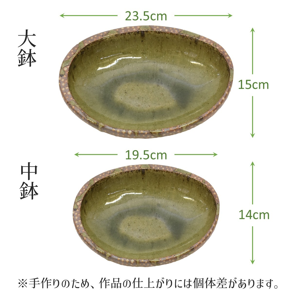 | 容量 | 大鉢(長さ23.5cm×幅15cm×高さ5cm) または 中鉢(長さ19.5cm×幅14cm×高さ3.5cm) |