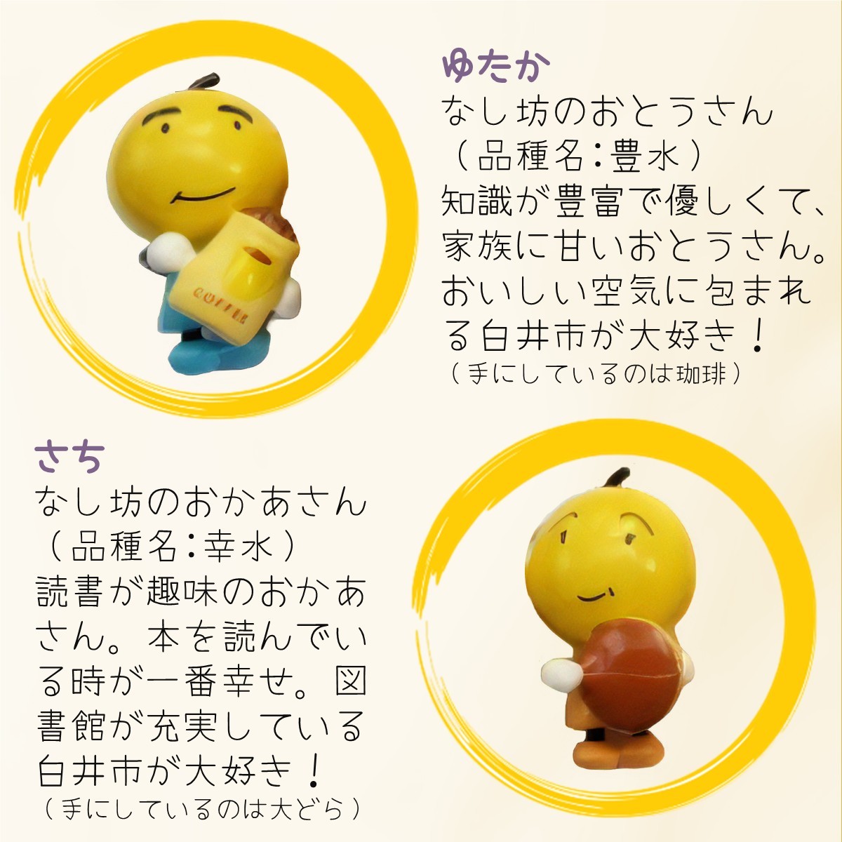 白井市のマスコットキャラクター「なし坊ファミリー」は、白井市の特産品“梨”のイメージキャラクターとして誕生しました。