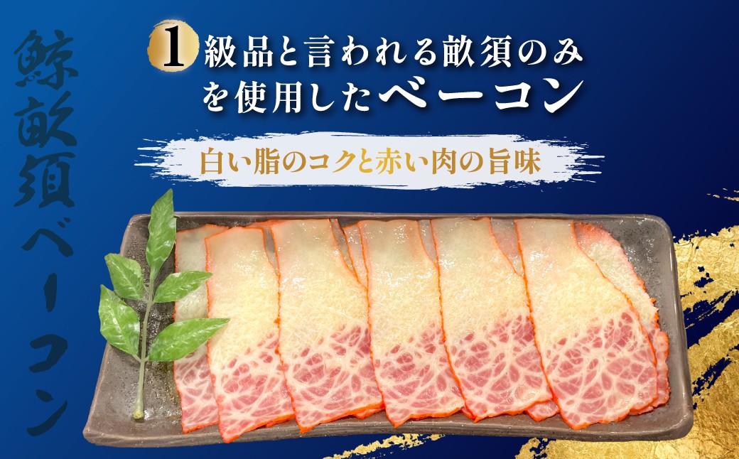 鯨ベーコンの原料で1級品と言われる畝須のみを使用したベーコンです。畝須とは鯨の下あごから腹にかけてある縦筋の部分で畝と須の子が一緒になった部位です。畝は白い脂身で須の子が赤い筋肉になります。昔から人気のある部位で白い脂のコクと赤い肉の旨味を一度に味わえます。鯨赤肉は『高たんぱく・低カロリー・低脂肪』とヘルシーです。畝須ベーコンはご家庭で食べやすい様に1.5mmでスライスし100gに小分けし赤肉も食べ切りサイズの100gにカットしました。