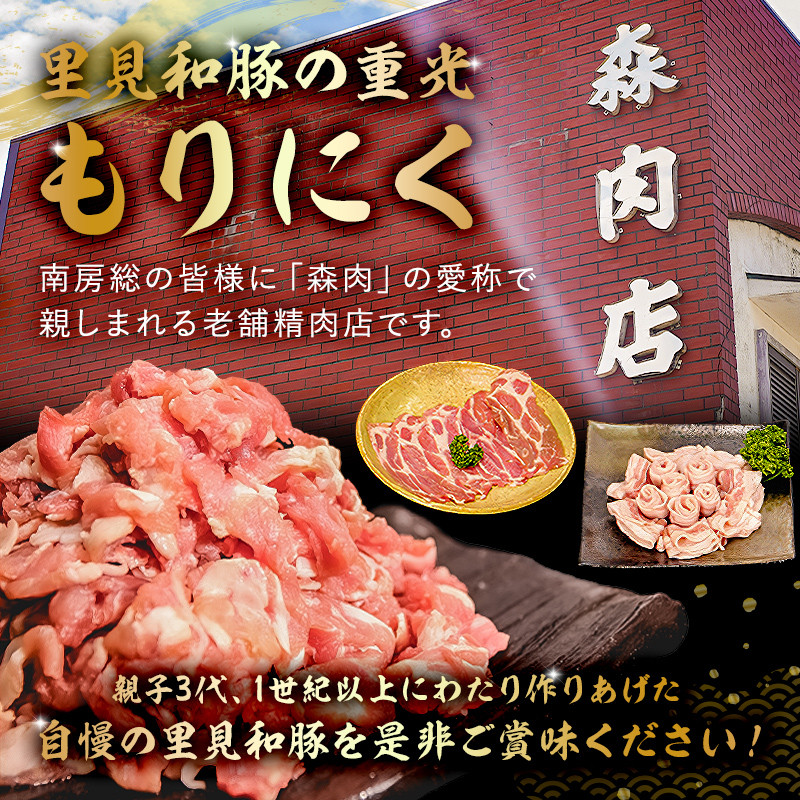 リピーターも多く、品質・使いやすい小分け包装は、さすが!!ブランド豚。メディアでも多く紹介される肉の重光が3代、1世紀以上にわたり作り上げた肉質は多くの料理研究家の方々からも絶賛されています。「甘い脂」に拘り続けたお肉は、南房総を題材にした「南総里見八犬伝」の里見を冠するにふさわしいブランド豚です。 【注意事項】 ※画像はイメージです。 【豚肉 お肉 国産 ブランド豚 挽肉 小間切れ】 【地場産品基準】 1号 市内の養豚場で飼育されたブランド豚を使用し加工したもの