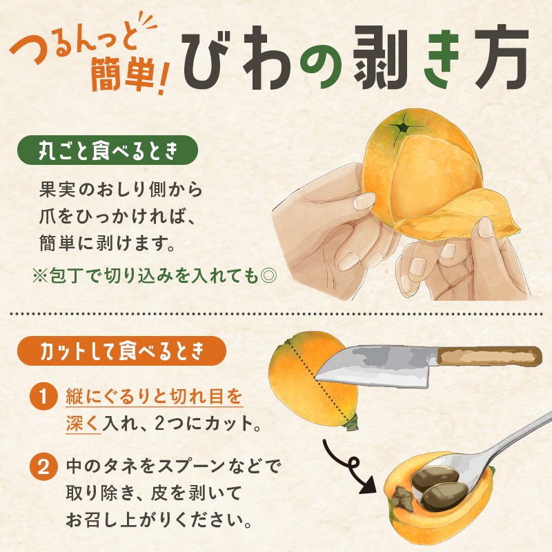 ※びわは追熟しないので、到着後1週間以内で出来るだけ早く召し上がった方が美味しく味わえます。