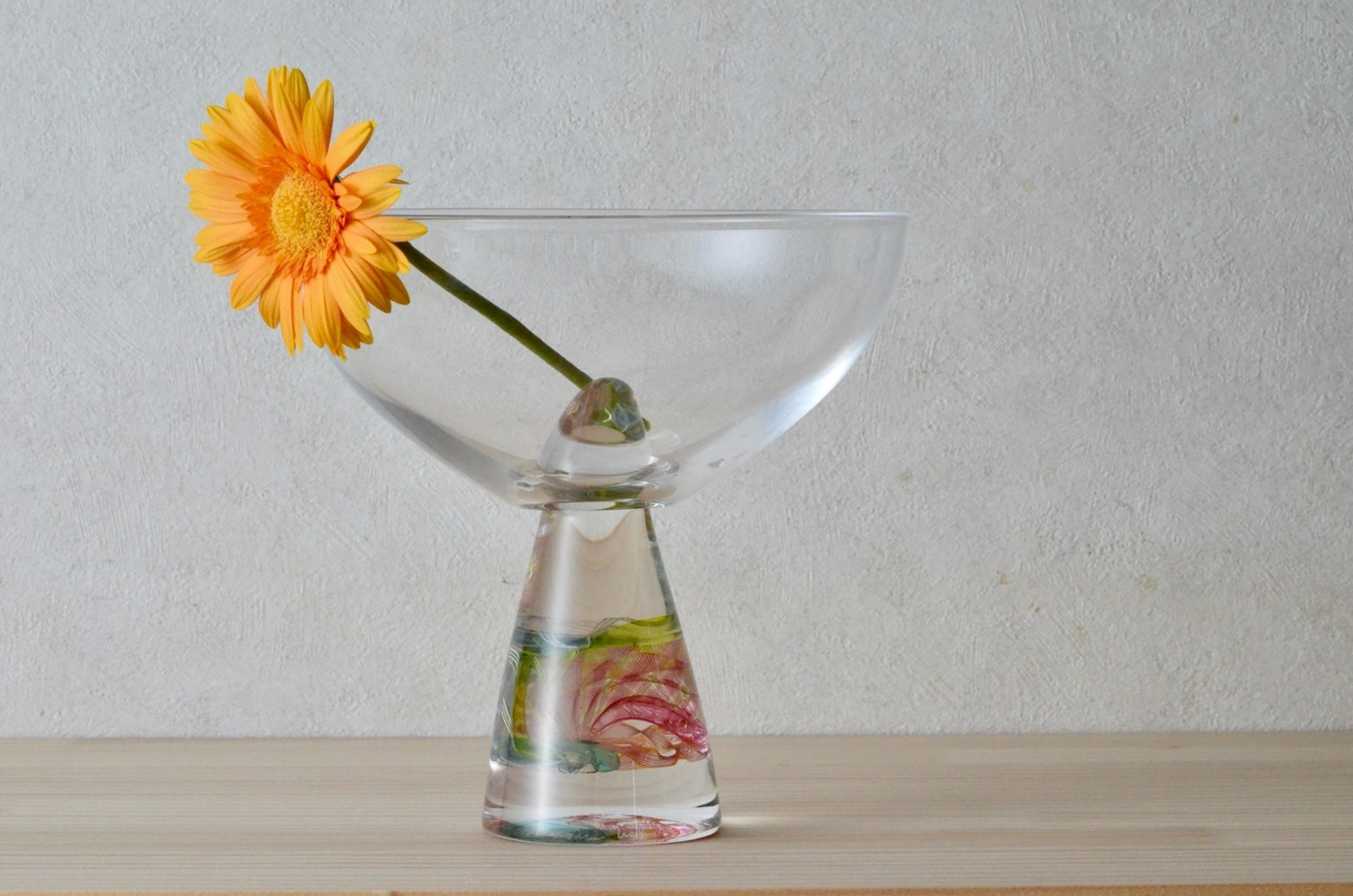 透明な鉢に、レース模様を閉じ込めた高台が突き刺さったような変わった器です。台の部分は透明とレース模様のコントラストが美しく、見る角度によっても印象が変わります。
