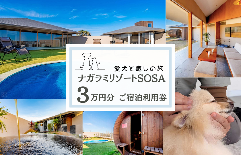 愛犬と過ごせる 黒湯の客室温泉&プライベートスパ 愛犬と癒しの旅 ナガラミリゾートSOSA ご宿泊利用券 3万円分 / 宿泊 宿泊券 リゾート ヴィラ ホテル 犬 ペット ドッグラン ドッグマッサージ 温泉 サウナ プール 旅行 リゾート旅