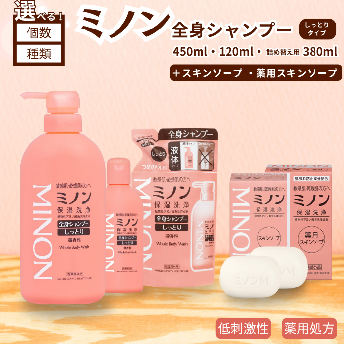 ミノン 全身シャンプーしっとりタイプ 120ml・450ml:各1本 詰替用(380ml)1個 ミノン薬用スキンソープorスキンソープ2個セット / 敏感肌 乾燥肌 全身シャンプー シャンプー ボディシャンプー ボディソープ 液体石鹸 石鹸 ボディケア スキンケア MINON 日用品 ミノン 第一三共ヘルスケア