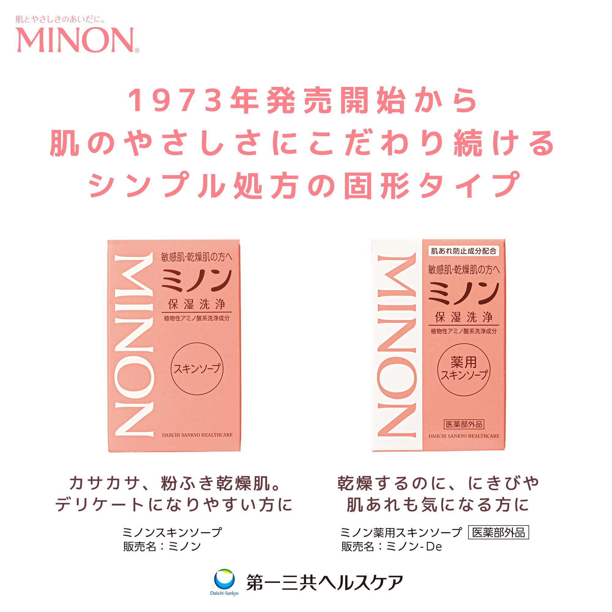 1973年、化粧品アレルギーによる肌トラブルをなくしたいという想いからミノンは誕生しました。 ブランド名の由来は「3つのNon」です。 Non allergic(アレルギーの原因物質を極力カット)、Non toxic(低刺激性/低毒性)、Non alkaline(弱酸性/アルカリ性でない) 開発当時から目指している「3つのこだわり」で、ミノンは赤ちゃんから高齢の方までお使いいただけるために、今もこの考え方を守ったものづくりを続けています。 ミノン 薬用スキンソープは、ほどよくうるおいを残して、つっぱり感のない洗い心地。 肌あれ・にきびを防ぐ薬用処方の固形石けんです。 乾燥するのに、にきびや肌あれも気になる方におすすめ! ◆ミノン薬用スキンソープの特長 ・植物性アミノ酸系洗浄成分配合 ・肌あれを防ぐ薬用処方 ・アレルギーの原因物質を極力カット ・低刺激性 ・弱酸性 ・無着色 ・無香料 肌に余計な負担をかけにくい処方設計で、赤ちゃんから高齢の方までお使いいただけます。 ※アレルギーテスト済み(すべての方にアレルギーが起こらないというわけではありません) 《成分》 ◎有効成分:アラントイン、グリチルリチン酸アンモニウム ◎その他の成分:アシルグルタミン酸Na、セタノール、酸化チタン 《香り》 無香料 ◆ミノンスキンソープ ミノン スキンソープは、バリア機能を守りながら洗うシンプル処方。デリケートな肌に余分な負担をかけにくい固形石けんです。カサカサ、粉ふき乾燥肌。デリケートになりやすい方におすすめ! 《特長》 「植物性アミノ酸系洗浄成分配合」「アレルギーの原因物質を極力カット」「低刺激性」「弱酸性」「無着色」「無香料」/肌に余計な負担をかけにくい処方設計で、赤ちゃんから高齢の方までお使いいただけます。 ※アレルギーテスト済み(すべての方にアレルギーが起こらないというわけではありません) 《成分》 パーム脂肪酸グルタミン酸Na、水、セタノール、酸化チタン、EDTA-2Na 《香り》 無香料