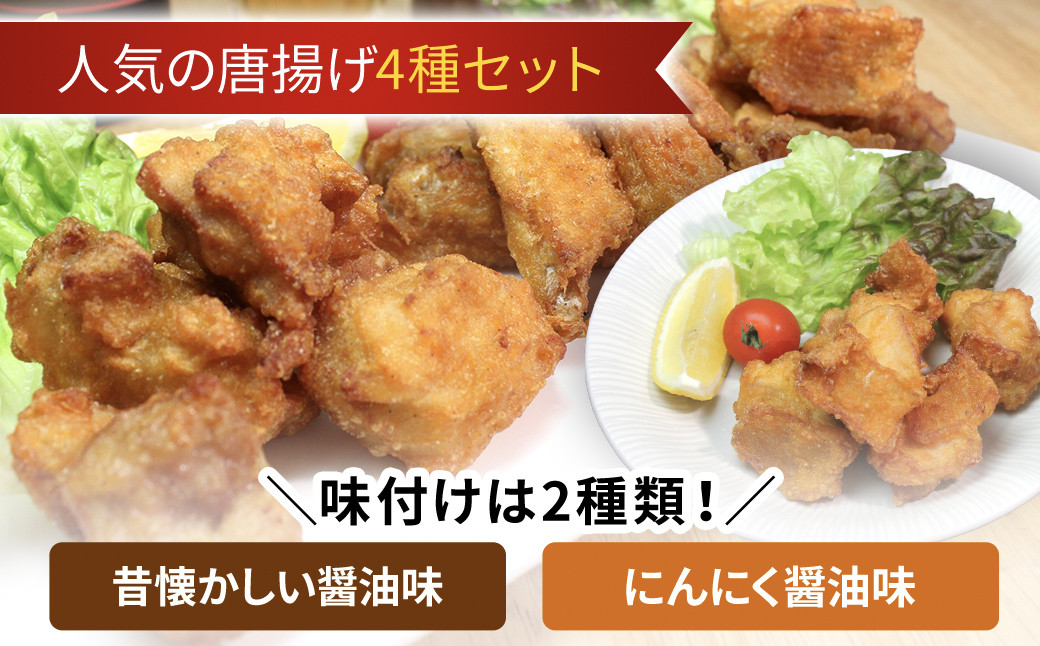 某有名通販サイトにて賞を3回受賞している鶏肉専門店「水郷のとりやさん」の自慢の唐揚げです!厳選された千葉県産「水郷どり」を使用しています。味付けは2種類。 1つは、醤油ベースの昔懐かしいオーソドックスな唐揚げ。この唐揚げは、味付けに地元「千葉県香取市産のちば醤油」を使用し、放し飼いの「自然卵」もたっぷり使用しています。ふんわりと柔らかくジューシーな唐揚げです。もも肉と胸肉の2種類ご用意いたしました。 もう1つはビールが飲みたくなるおつまみ唐揚げ『にんにく醤油味』です。カリッ!サクッとした食感が楽しめます。鶏肉とにんにくの相性は抜群!お箸が止まらなくなると思います。胸肉と手羽先の2種類ご用意いたしました。 ■生産者の声 鶏肉専門店「水郷のとりやさん」のお礼品をご覧いただき、誠にありがとうございます。 水郷のとりやさんは千葉県香取市で1921年より商売をしてまいりました。 寄付者様の食卓に笑顔をお届けできるように、心をこめてお届けいたします。鶏肉専門店ならではの美味しさをご賞味ください。 ■内容量/加工地 水郷どりもも肉の唐揚げ(生・400g) 水郷どり胸肉の唐揚げ(生・500g) 水郷どりにんにく醤油唐揚げ(手羽先・生・400g) 水郷どりにんにく醤油唐揚げ(むね・生・400g) 加工地:千葉県 ■原材料 水郷どりの唐揚げ(もも肉・胸肉)/鶏肉(国産)、醤油、酒、生姜、卵、片栗粉、塩、胡椒、調味料(アミノ酸等)(原材料の一部に小麦、卵を含む) 水郷どりにんにく醤油唐揚げ(手羽先・胸肉)/鶏肉(国産)、小麦粉、澱粉、食塩、にんにく、粉末醤油、ぶどう糖、砂糖、黒胡椒、オニオンパウダー、脱脂粉乳、加工でん粉、調味料(アミノ酸)、ベーキングパウダー、乳化剤、パプリカ色素(原材料の一部に小麦、乳を含む) ■賞味期限 すべて90日 ■備考 ※画像はイメージです。 ※離島、沖縄県にはお届けできない返礼品です