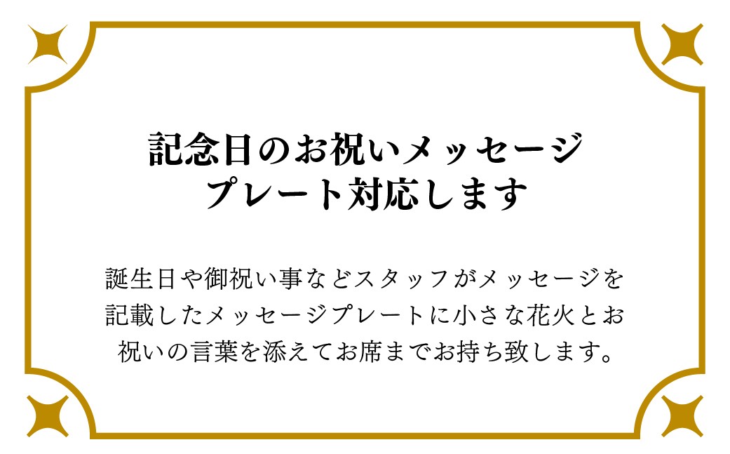 誕生日や御祝い事などスタッフがメッセージを記載したメッセージプレートに小さな花火とお祝いの言葉を添えてお席までお持ち致します。