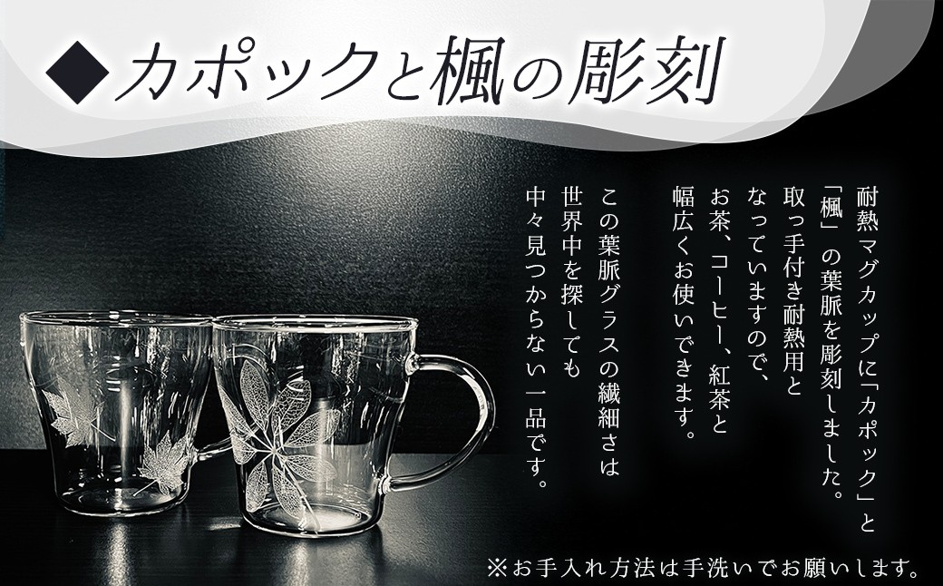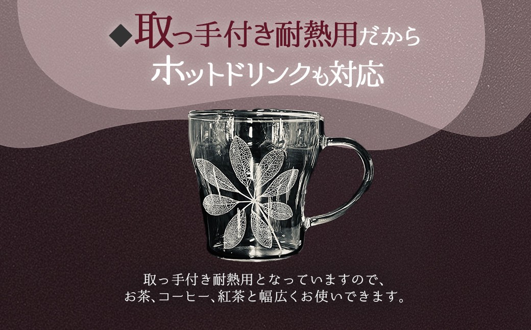 耐熱マグカップに”カポック”と”楓”の葉脈を彫刻しました。取っ手付き耐熱用となっていますので、お茶、コーヒー、紅茶と幅広くお使いできます。