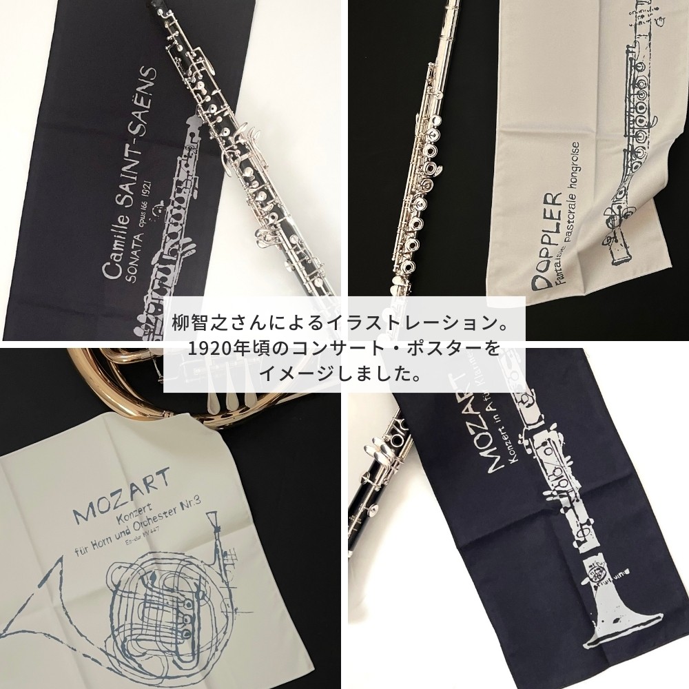 イラストレーター 柳 智之さんによる4種類の楽器のオリジナルイラストが描かれたクロスは、各楽器にピッタリな大判サイズ。