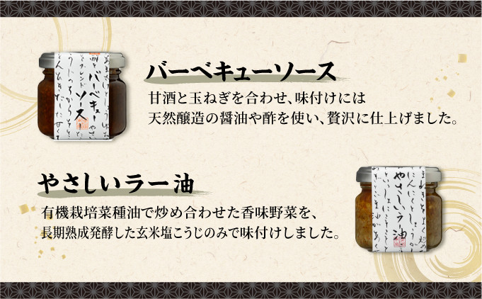 げんまい塩こうじ、酒粕ちいず、甘酒バーベキューソース、バーニャカウダ、やさしいラー油の5種詰め合わせです。