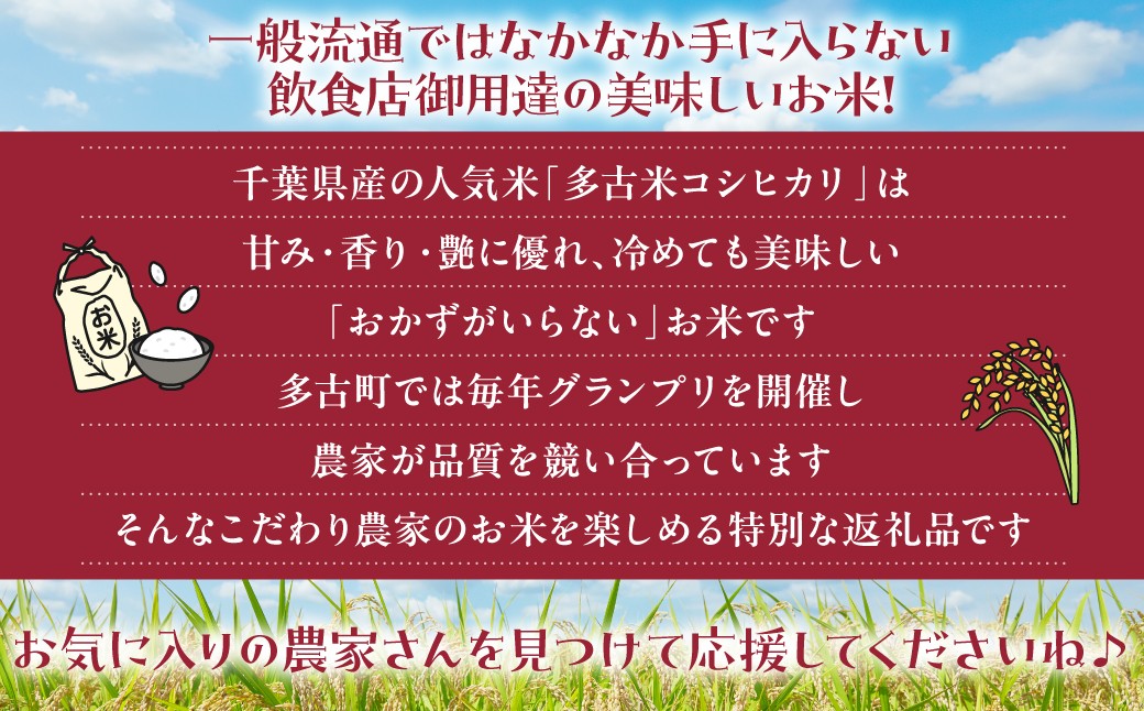 千葉県の銘柄米として人気が高い多古米コシヒカリは、ほのかな甘みと香り、艶、冷めてもおいしい「おかずがいらない」と言われるお米です。
