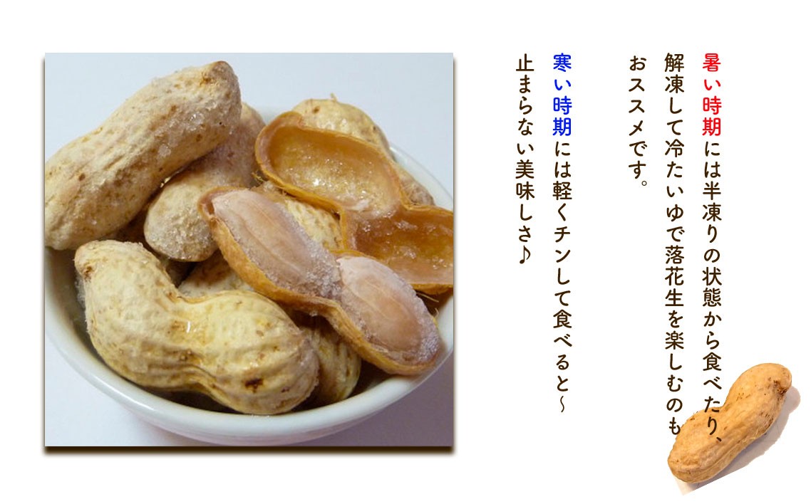 暑い時期には半凍りの状態から食べたり、解凍して冷たいゆで落花生を楽しむのもおススメです。