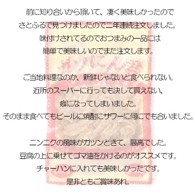 | 容量 | 【1~12回目】ガツのにんにく漬(200g×3P) ガツのにんにく漬(200g×3P) 製造地:千葉県横芝光町 ■原材料:お礼品に記載 ※アレルギー物質などの表示につきましては、サポートセンターまでご連絡ください。 ◆生産者の声◆ 愛され続けて30年以上、変わらない味をお届けしています。 皆さまに安心安全なお礼品を提供するため、一つ一つ手作業でお造りしています。 橋村商店の鮮度バツグンで新鮮な豚のもつ(ホルモン)は レストランや居酒屋、焼き鳥屋、焼肉屋で多数ご使いいただいております。 新鮮で安全な食品の供給をモットーに自社工場で加工したもつ(ホルモン)を迅速にお届けいたします。 橋村商店は地元、千葉県の横芝光町営東陽食肉センターに直結した自社工場で加工した 新鮮な豚のホルモン(もつ)を厳選してお届けします。 当店では素材の品質はもちろん、細かく丹念に包丁で加工します。 手間をかけることで、味もぜんぜん違います。 また、手間隙かけたホルモン(もつ)を最適な方法で梱包してお届けします。 新鮮で安全な激うまホルモン(もつ)を是非、お試しください。 ■注意事項/その他 ※冷凍保存をする場合(お礼品到着後すぐに冷凍庫へお入れください。)は約2ヶ月持ちます。 ※お召し上がりの際は、冷蔵庫に入れ解凍してください。お急ぎの際は袋のまま流水で解凍してください。 癒されるなら横芝光 Go East, Be Released. |
