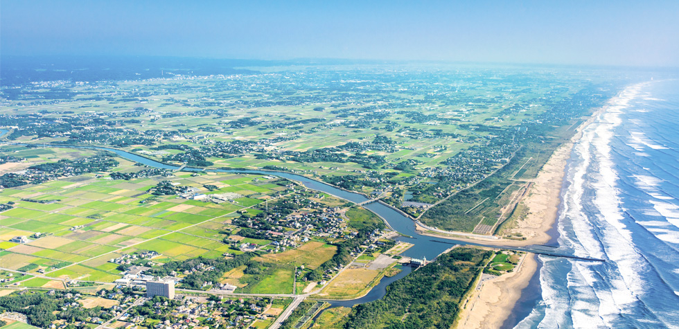 わが町は千葉県の北東部に位置します。町の中心部を栗山川が流れ、町南部には太平洋に面した九十九里浜を擁します。あちらこちらに田園風景が広がり、懐かしさを覚える里山風景があります。関東平野らしい大変開放的な地形に恵まれた、首都圏にあるのどかな町です。そして、自然と産業が融合し築き上げられてきた文化の豊かな町です。