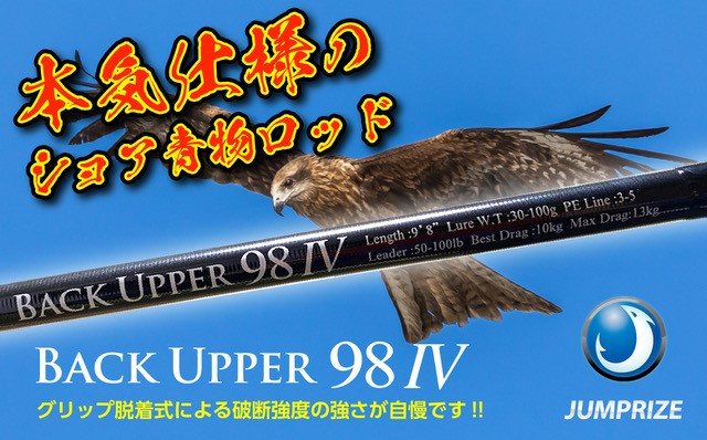 一宮町に本社を置く釣具メーカー株式会社ジャンプライズの大人気ショア青物ロッド『バックアッパー98/4』です。ターゲットはヒラマサ・ブリ・カンパチ・キハダ等マルチに使えます。外房もジギングのメッカです。ぜひ、千葉県にも釣りにお越しください。 グリップ脱着システムを採用した、高いブランクス強度を持ったショア青物ロッド【バックアッパーシリーズ】 98Ⅲ、95Ⅱはショア青物ゲームで大きな実績を残し、オフショアキャスティングでも活躍しています。 今回の98Ⅳは全国のショア青物アングラーが一番必要とするPE4号、5号に対応したモデル。 キャスティング性能とファイト時の高反発を重視し、中弾性24tをメインにしながら、さらに低弾性15tで補強。45度角度であれば10㎏ドラグを常用可能なブランクスパワーであり、90度角度での高負荷ファイトも前提とした設計です。 強度テストの一環として、オフショアで58キロを筆頭に30本以上の良型キハダを仕留めた実績もあります。 ショア青物ゲームでの抜き上げや、ズリ上げに対する十分な耐性を得ることに注力しました。。 30g~100gのトップウォーター・ミノー・シンキングプラグ・180gまでのメタルジグの使用が◎。 PE2~3号では対応が難しいシチュエーションで大活躍する本気仕様のショア青物ロッドです。 【スペック】 全長:9.8ft 重量:363g ルアー:30~100g ライン:3~5 リーダー:50~100lb 仕舞寸法:224㎝ ガイド:Fuji SICリング 適合ドラグ:10㎏(MAX13㎏) ※さらに商品の詳しい内容は公式サイトよりご確認下さい。