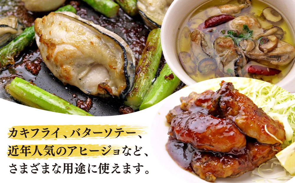 カキフライ、バターソテー、近年人気のアヒージョなど、さまざまな用途に使えるご家庭の冷凍庫に常備しておきたい冷凍むき身牡蠣です。