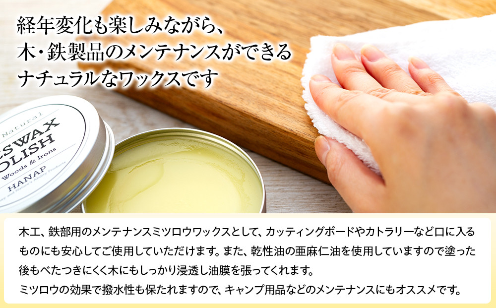愛せるものを永く使う生活を始めませんか?経年変化も楽しみながら、木・鉄製品のメンテナンスができるナチュラルなワックスです。 原材料はミツロウと亜麻仁油のみ。 木工、鉄部用のメンテナンスミツロウワックスとして、カッティングボードやカトラリーなど口に入るものにも安心してご使用していただけます。 また、乾性油の亜麻仁油を使用していますので塗った後もべたつきにくく木にもしっかり浸透し油膜を張ってくれます。 ミツロウの効果で撥水性も保たれますので、キャンプ用品などのメンテナンスにもオススメです。 スキレットやダッチオーブンなど鉄製品の面倒なシーズニングやメンテナンスも、洗った後タオルで水気を取りのぞき塗布していただくだけで使用時の焦げ付き防止や錆び止め効果が得られます。 革製品のメンテナンスにも使用できますが、革の種類により仕上がりが変わる場合がございますのでご注意ください。