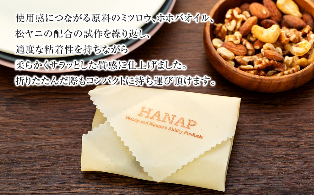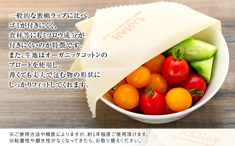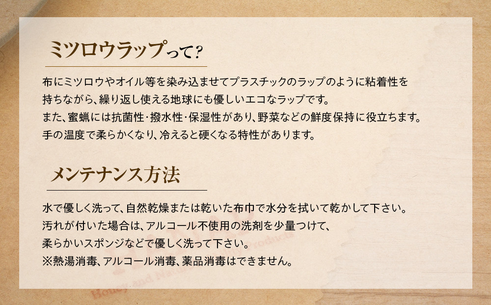 その為一般的な蜜蝋ラップに比べ、ゴミが付きにくく、食材等にもミツロウ成分が付きにくいのが特徴です。