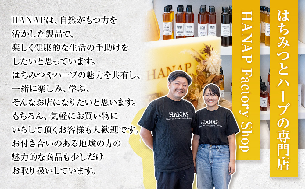 千葉県で採れた風味の異なる純粋はちみつ70g2種類と人気のはちみつ漬け2種類をセットしたスペシャルセット。 【HANAPの純粋はちみつについて】 『この土地でこの日にしか生まれない味をそのままに』 ミツバチは巣箱から2〜3kmで咲いている様々な花から蜜を集め、はちみつを作ります。 場所と時期により、咲いている花の種類が変わるため、はちみつの風味や色が異なります。 唯一無二の風味をお楽しみいただきたいという想いで、採蜜した地名と日にち毎に風味の異なるはちみつをお届けしています。 また、私たちのはちみつは、生産・製造・販売まで全てを自社で行なっております。 ロット毎に品質の確認とテイスティングをし、合格したものだけを純粋はちみつとして販売をしております。 ・日本養蜂協会会員/養蜂産業振興会会員 ・日本はちみつマイスター協会認定講師 【受賞歴】 ・2024年 第7回 HONEY OF THE YEAR 国産部門 優秀賞 ※1歳未満のお子様には与えないでください。 【燻製落花生のはちみつ漬けについて】 落花生は千葉県八街産の風味がよく最高品種とされる”千葉半立”を贅沢に使用。 落花生を焙煎後、焦げなどの欠点豆はハンドピックで丁寧に取り除き、桜・くるみ・ホワイトオークをブレンドしたチップで燻製加工しています。 また、使用するはちみつは燻製に合うコクのあるHANAPの千葉県産純粋はちみつを選別しています。 落花生は、はちみつにつけることで柔らかくしっとりし、はちみつは落花生の燻製香が浸透し、ビターで甘過ぎずマイルドな味わいを楽しむことができるのが特徴です。 【ドライフルーツのはちみつ漬けについて】 女性に嬉しい栄養素がたっぷりのドライイチジク・ドライブラックマルベリー・カカオニブを千葉県産純粋はちみつに贅沢に漬け込みました。 はちみつ漬けになる事で、イチジクとマルベリーはしっとりした食感をお楽しみ頂けます。 また、カカオニブの苦みと食感が良いアクセントになっています。 はちみつにもドライフルーツの味わいが移り、より味わい深くなっています。 HANAPの養蜂場で採れた100%国産(千葉県産)純粋はちみつを使用しています。 試作を繰り返し、ドライフルーツと馴染みが良い風味のはちみつを厳選しています。