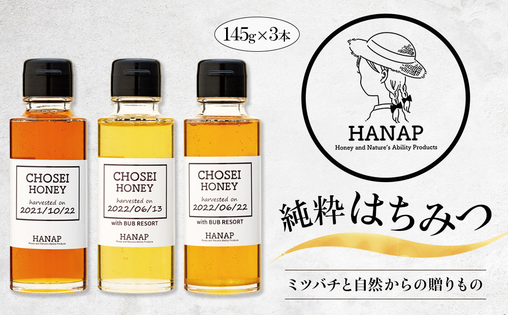 千葉県で採れた人気の風味の純粋はちみつ145g×3種類をセットにしました。 それぞれ風味の違いをしっかり楽しめる贅沢なセットになっております。 熨斗対応・リボン対応もしております。 ※写真のはちみつはイメージです。はちみつの種類は風味の違いを楽しめるものを選ばせていただきます。 【HANAPの純粋はちみつについて】 『この土地でこの日にしか生まれない味をそのままに』 ミツバチは巣箱から2〜3kmで咲いている様々な花から蜜を集め、はちみつを作ります。 場所と時期により、咲いている花の種類が変わるため、はちみつの風味や色が異なります。 唯一無二の風味をお楽しみいただきたいという想いで、採蜜した地名と日にち毎に風味の異なるはちみつをお届けしています。 また、私たちのはちみつは、生産・製造・販売まで全てを自社で行なっております。 ロット毎に品質の確認とテイスティングをし、合格したものだけを純粋はちみつとして販売をしております。 ・日本養蜂協会会員/養蜂産業振興会会員 ・日本はちみつマイスター協会認定講師 【受賞歴】 ・2024年 第7回 HONEY OF THE YEAR 国産部門 優秀賞 ※1歳未満のお子様には与えないでください。 ※結晶化することがあります。その場合は、容器の蓋を開け、50℃程度に温めて頂くと液体に戻すことが出来ます。 【熨斗/リボン/メッセージカード/オリジナル紙袋お付けできます】 ※申込時「自治体からのアンケート」欄の「その他連絡事項」にご記入ください。 ①熨斗又はリボン 備考欄に熨斗又はリボンの有無 熨斗の場合は、お年賀/お祝い等の種類のご指定、名入れの場合は名前をご記入お願い致します。 ②メッセージカードの有無 HANAPオリジナルメッセージカード希望の有無をご記入ください。 ③お渡し用紙袋の有無