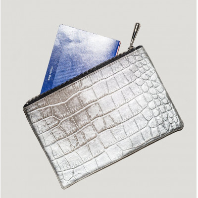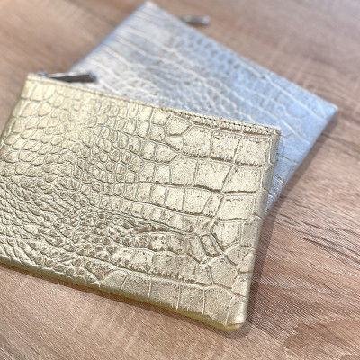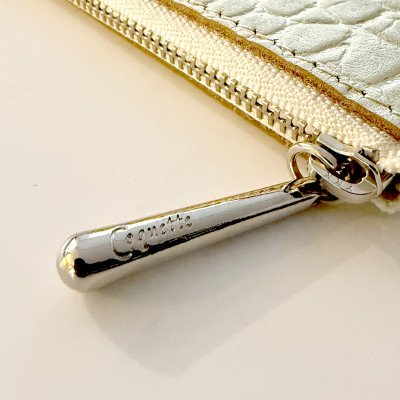 クロコの型押しをした牛革にメタリックな箔の加工を施した後、手作業で箔を少し荒らすことで輝きを抑えた上品な印象に。