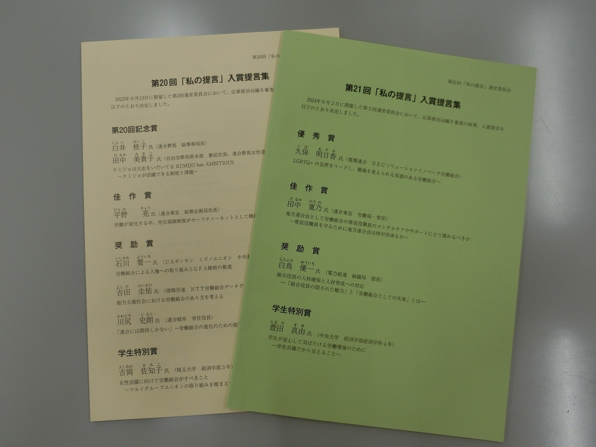 「私の提言」募集事業は、すべての人が安心して働き、暮らすことのできる社会の実現に向けて、労働組合・連合に期待すること、取り組むべきことなどを提言として毎年募集しています。働く人、労働組合員だけでなく、どなたからの応募も受け付けており、入賞提言の表彰、入賞提言集の発行・配布などを行っています。応募いただいた提言は、有識者・労働組合関係者からなる運営委員会メンバーがすべて読んで審査します。
