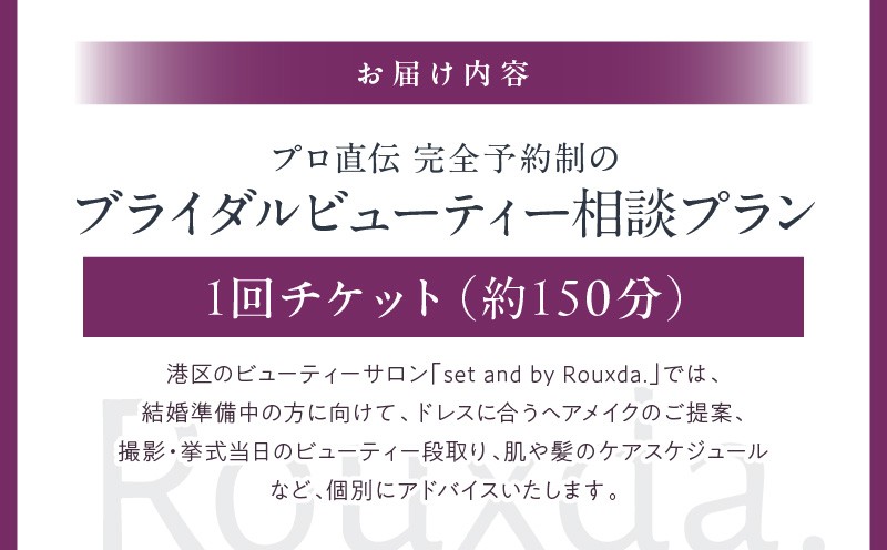 | 容量 | 港区のビューティーサロン「set and by Rouxda.」で提供する、結婚準備中の方に向けた、プロのブライダルヘアメイクアーティストによるビューティーカウンセリング(約150分) ドレスに合うヘアメイクの提案や、撮影・挙式当日のビューティー段取り、肌や髪のケアスケジュール等を含めた個別アドバイスを行います。 相談後はオリジナルビューティープランシートをお渡しします。 |