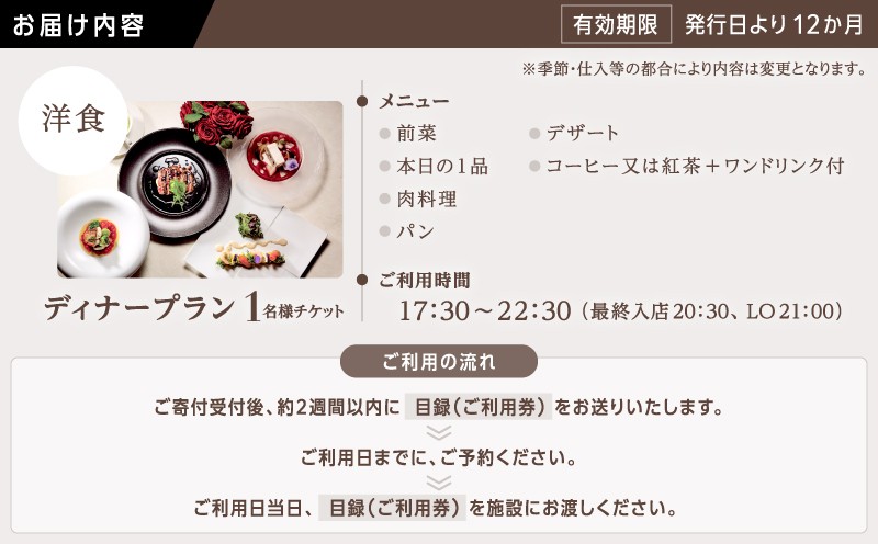 | 容量 | 1名様ディナープラン 利用時間:17:30~22:30(最終入店20:30、LO21:00) 食事内容:洋食 メニュー:前菜・本日の1品・肉料理・パン・デザート・コーヒー又は紅茶+ワンドリンク付 ※季節・仕入等の都合により内容は変更となります。 |