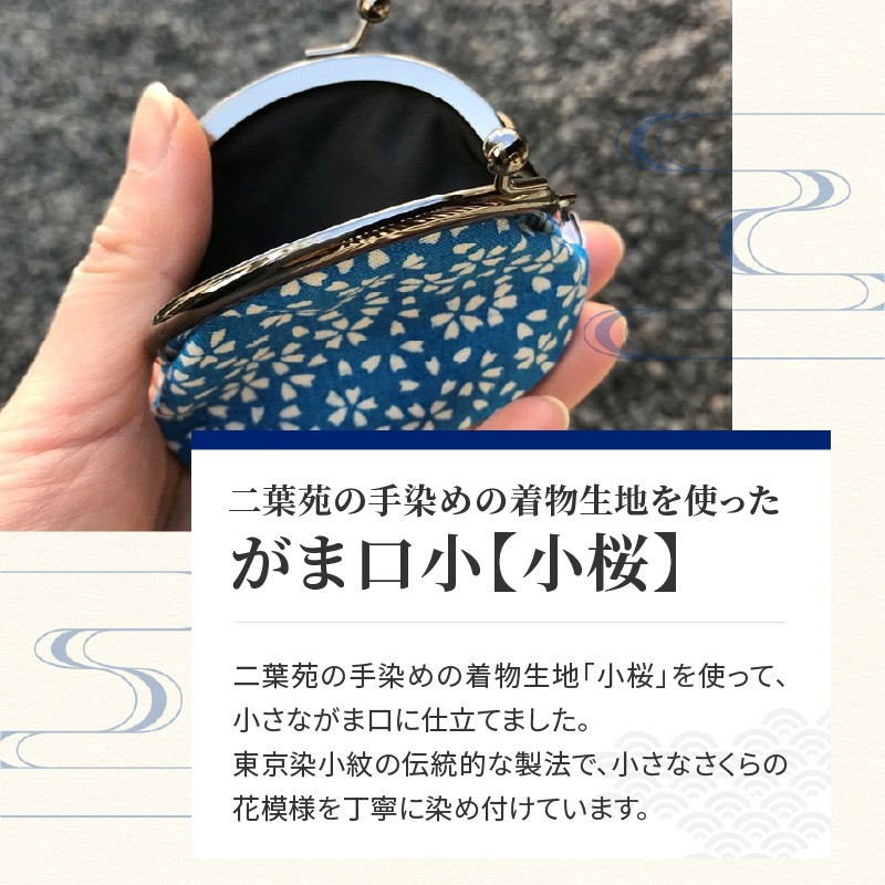 二葉苑の手染めの着物生地を使って小さながま口に仕立てました。東京染小紋の伝統的な製法で、小さなさくらの花模様を染め付けました。