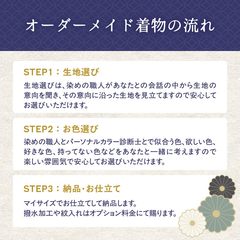 作り手である職人と一緒にオーダーメイドで着物が作れます。 【完全オーダーメイド着物~失敗しない色無地着物 袷~】