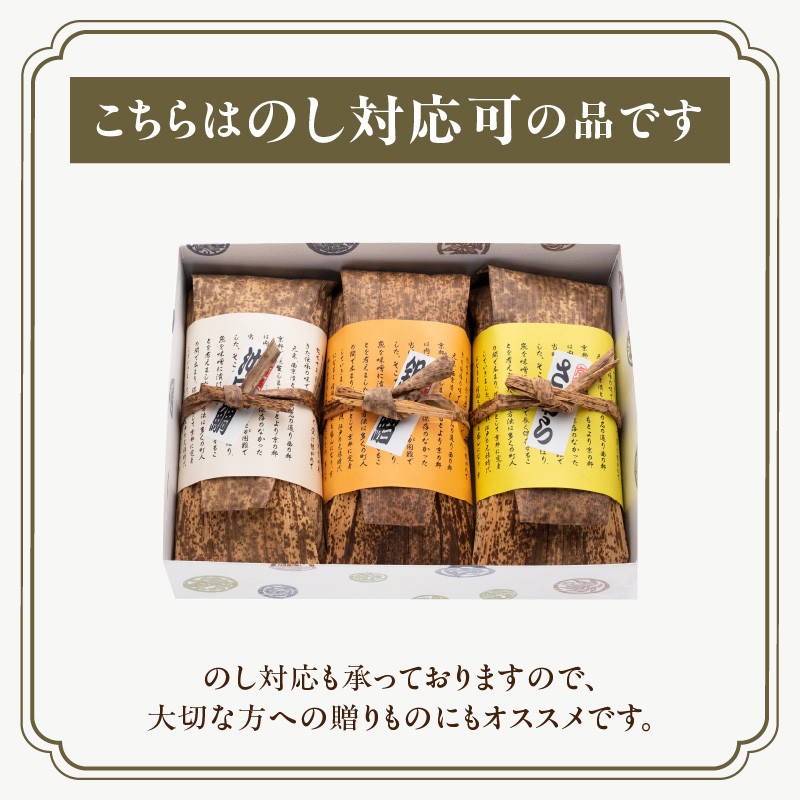 | 容量 | 京華漬竹皮包み・銀鱈130g×3、沖目鯛130g×3、鰆130g×3 |