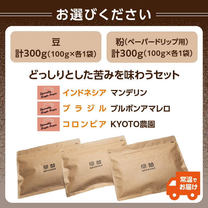 どっしりとした苦味を味わうスペシャルティコーヒー3種類の詰め合わせです。 【早苗】焙煎珈琲豆(どっしりとした苦みを味わうセット 3種×各100g) スペシャルティコーヒー 珈琲 セット 3種 しっかり焙煎 苦め コク深 ジッパー チャック付き 豆 粉 東京 新宿 0020-005-S05