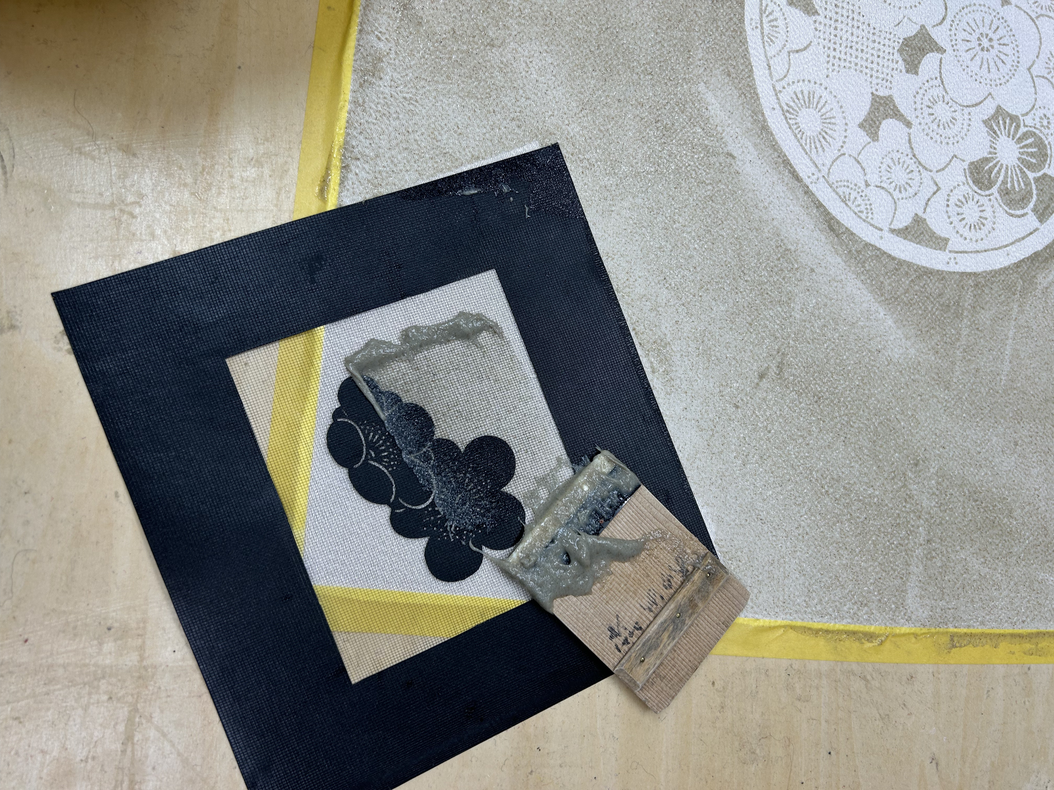 体験内容は、絹ちりめん小風呂敷に、型紙を使用し糊置きした布の上に、染色をして頂きます。最初に午前中に、当工房の型紙を用いて小風呂敷生地に糊置きをします。乾燥させて午後から染色します。使用染料は顔料を大豆の汁で溶き、三回の染工程で色付けをします。当工房では、可能な限り自然な材料で、自然な色、風合いを重視しています。あなただけの小風呂敷に仕上がります。
