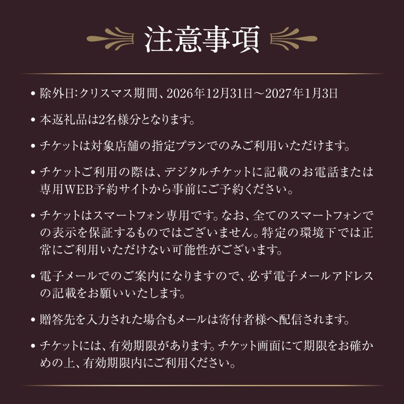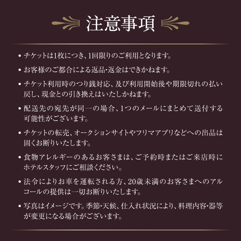 ご入金確認後、14日前後でデジタルチケットをメールで配信します ※本返礼品は、紙の券面でのお食事券を直接ご郵送するものではなく、【デジタルチケット】(URL)をメールでお送りするものです。ご利用方法をご確認のうえ、お申し込みください。 ※ご使用の端末の設定により、迷惑メールに振り分けられる場合がございます。 support@shinjuku.furusato-lg.jpを受信設定ください。 【注意事項】 ※除外日:クリスマス期間、2026年12月31日~2027年1月3日 ※本返礼品は2名様分となります。 ※チケットは対象店舗の指定メニューでのみご利用いただけます。 ※乾杯ドリンクは、スパークリングワイン、生ビール、ワイン、カクテル、ノンアルコールカクテル等からお選びいただけます。 ※チケットご利用の際は、デジタルチケットに記載のお電話または専用WEB予約サイトから事前にご予約ください。 ※チケットはスマートフォン専用です。なお、全てのスマートフォンでの表示を保証するものではございません。特定の環境下では正常にご利用いただけない可能性がございます。 ※贈答先を入力された場合もメールは寄付者様へ配信されます。 ※チケットは1枚につき、1回限りのご利用となります。 ※チケットには、有効期限があります。チケット画面にて期限をお確かめの上、有効期限内にご利用ください。 ※寄附者様のご都合による返品・返金はできかねます。 ※チケット利用時のつり銭対応、及び利用開始後や期限切れの払い戻し、現金との引き換えはいたしかねます。 ※チケットの転売、オークションサイトやフリマアプリなどへの出品は固くお断りいたします。 ※食物アレルギーのあるお客さまは、ご予約時またはご来店時にホテルスタッフにご相談ください。 ※法令によりお車を運転される方、20歳未満のお客さまへのアルコールの提供は一切お断りいたします。 ※写真はイメージです。季節・天候、仕入れ状況により、料理内容・器等が変更になる場合がございます。 |