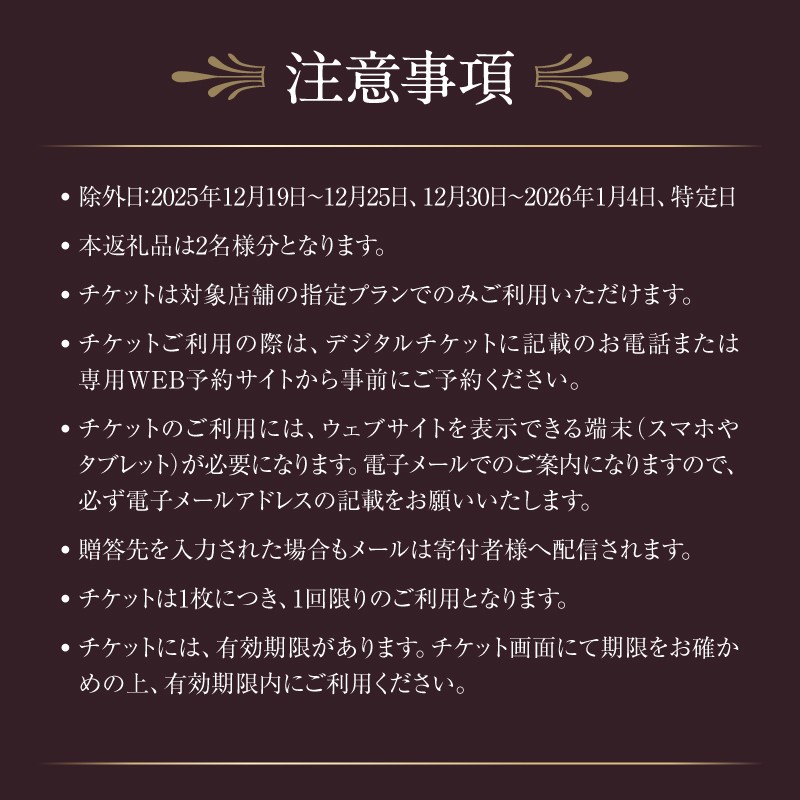 | 発送期日 | デジタルチケットをメールで配信します ※本返礼品は、紙の券面でのお食事券を直接ご郵送するものではなく、【デジタルチケット】(URL)をメールでお送りするものです。ご利用方法をご確認のうえ、お申し込みください。 【注意事項】 ※除外日:2025年12月19日~12月25日、12月30日~2026年1月4日、特定日 ※本返礼品は2名様分となります。 ※チケットは対象店舗の指定メニューでのみご利用いただけます。 ※チケットご利用の際は、デジタルチケットに記載のお電話または専用WEB予約サイトから事前にご予約ください。 ※チケットのご利用には、ウェブサイトを表示できる端末(スマホやタブレット)が必要になります。 ※贈答先を入力された場合もメールは寄付者様へ配信されます。 ※チケットは1枚につき、1回限りのご利用となります。 ※チケットには、有効期限があります。チケット画面にて期限をお確かめの上、有効期限内にご利用ください。 ※寄附者様のご都合による返品・返金はできかねます。 ※チケット利用時のつり銭対応、及び利用開始後や期限切れの払い戻し、現金との引き換えはいたしかねます。 ※チケットの転売、オークションサイトやフリマアプリなどへの出品は固くお断りいたします。 ※食物アレルギーのあるお客さまは、ご予約時またはご来店時にホテルスタッフにご相談ください。 ※法令によりお車を運転される方、20歳未満のお客さまへのアルコールの提供は一切お断りいたします。 ※写真はイメージです。季節・天候、仕入れ状況により、料理内容・器等が変更になる場合がございます。 |