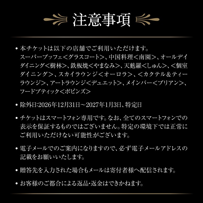 ご入金確認後、14日前後でデジタルチケットをメールで配信します ※本返礼品は、紙の券面でのお食事券を直接ご郵送するものではなく、【デジタルチケット】(URL)をメールでお送りするものです。ご利用方法をご確認のうえ、お申し込みください。 ※ご使用の端末の設定により、迷惑メールに振り分けられる場合がございます。 support@shinjuku.furusato-lg.jpを受信設定ください。 【注意事項】 ※除外日:2026年12月31日~2027年1月3日 ※チケットはスマートフォン専用です。なお、全てのスマートフォンでの表示を保証するものではございません。特定の環境下では正常にご利用いただけない可能性がございます。 ※贈答先を入力された場合もメールは寄付者様へ配信されます。 ※チケットは1枚につき、1回限りのご利用となります。 ※チケットには、有効期限があります。チケット画面にて期限をお確かめの上、有効期限内にご利用ください。 ※寄附者様のご都合による返品・返金はできかねます。 ※チケット利用時のつり銭対応、及び利用開始後や期限切れの払い戻し、現金との引き換えはいたしかねます。 ※チケットの転売、オークションサイトやフリマアプリなどへの出品は固くお断りいたします。 ※食物アレルギーのあるお客さまは、ご予約時またはご来店時にホテルスタッフにご相談ください ※法令によりお車を運転される方、20歳未満のお客さまへのアルコールの提供は一切お断りいたします。 ※写真はイメージです。季節・天候、仕入れ状況により、料理内容・器等が変更になる場合がございます。 |