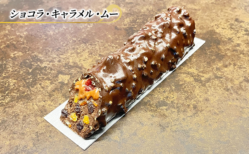 「ショコラ・キャラメル・ムー」は濃厚なチョコレートの生地にキャラメルとナッツ、ドライフルーツをちりばめたケーキです。