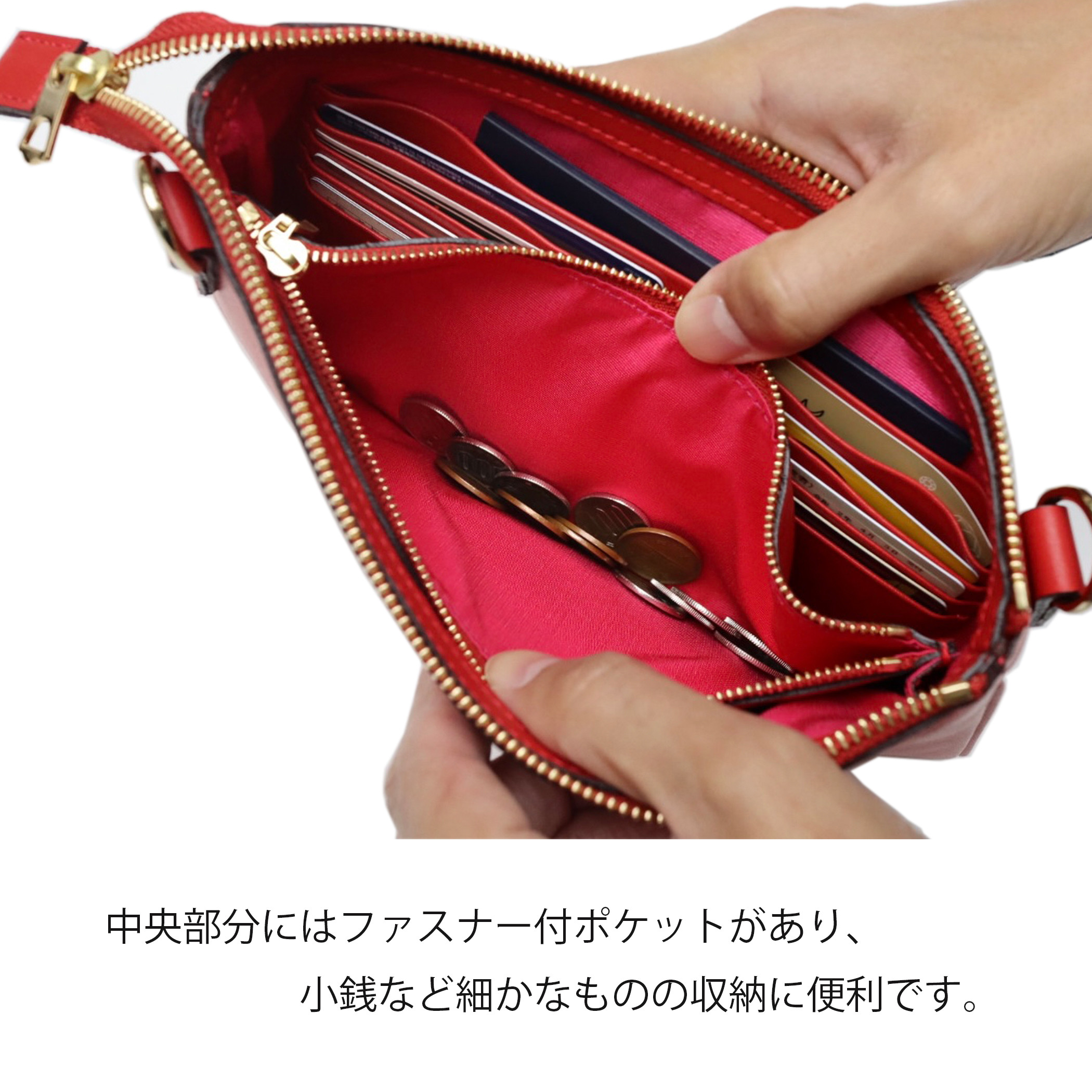 中央にファスナーポケットが1つ・カード収納が8か所・お札やパスポート入れ、手帳などが入るスペースが3か所ほど備わっており、こちらのバッグ1つで手軽にお出かけできます。