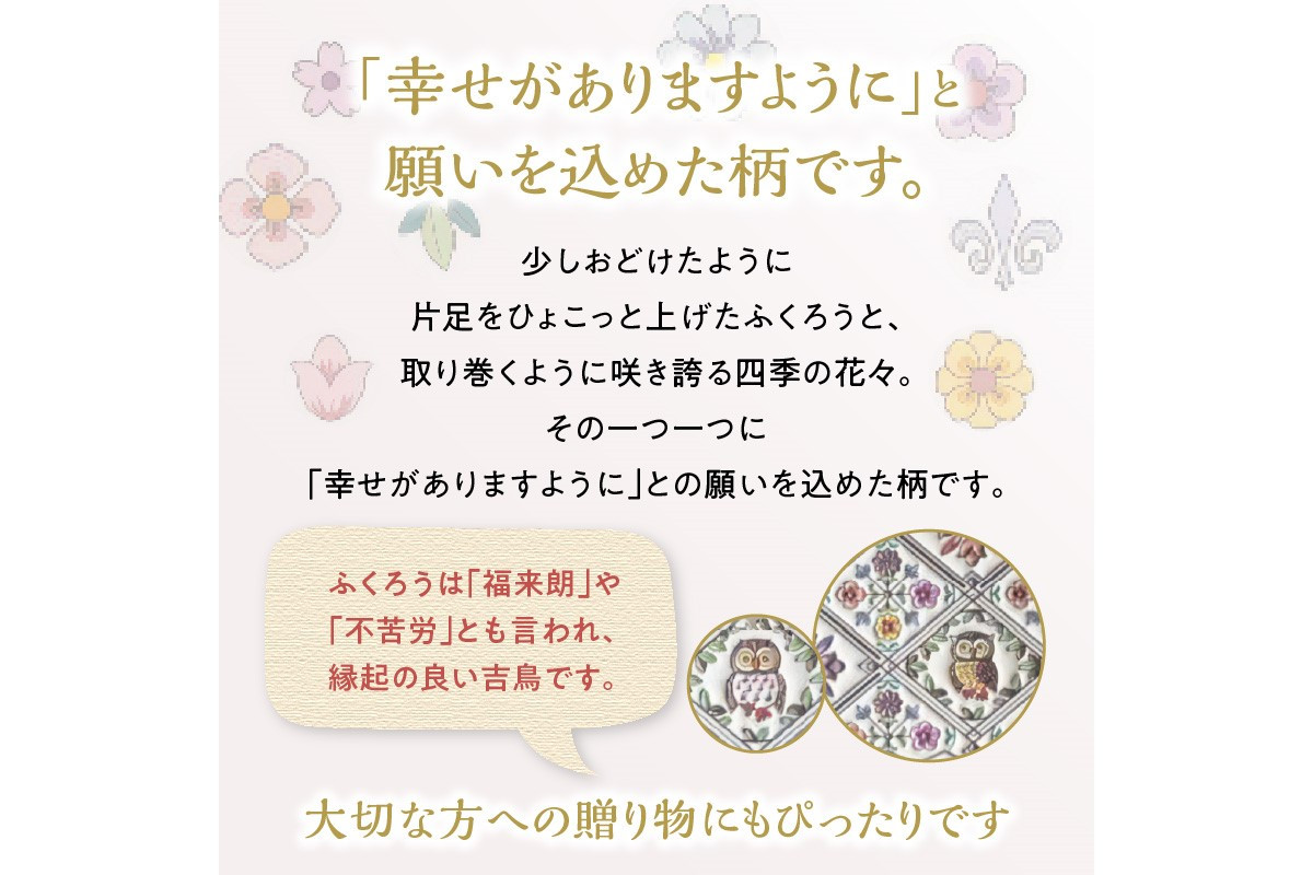 神秘的で縁起の良い鳥とされるふくろう柄。親子が描かれていて愛らしいデザイン。スリムな形を保てるL字ファスナー型。根付付き。