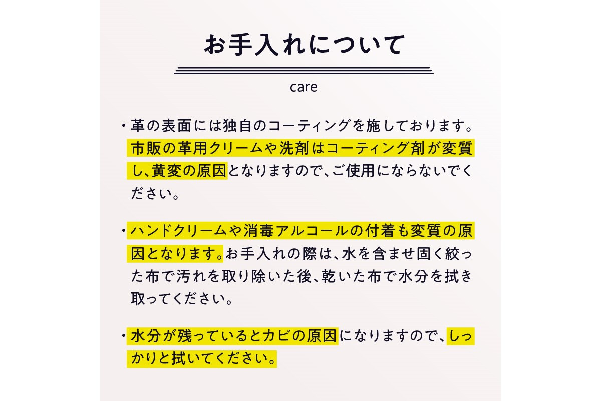 革の表面には独自のコーティングを施しております。市販の革用クリームや洗剤はコーティング剤が変質し、黄変の原因となりますので、ご使用にならないで下さい。