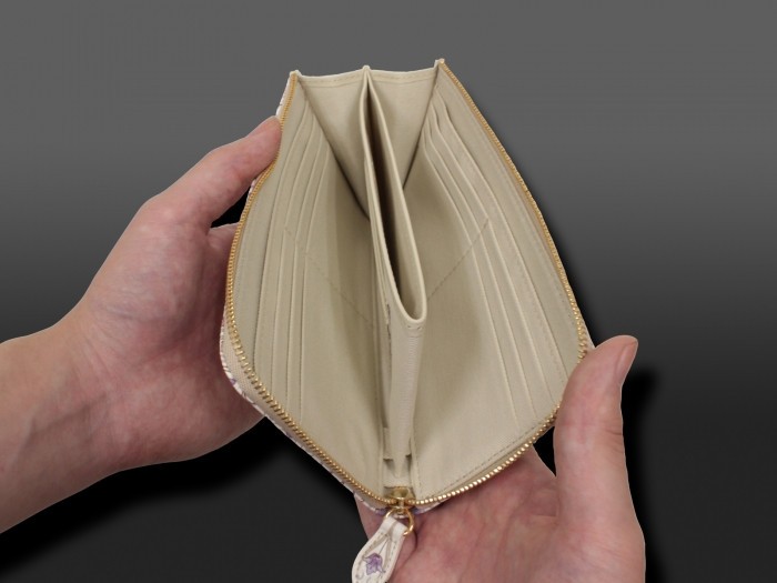 日本と東方世界を象徴する植物が混ざり合ったオリエント柄。しっかり収納しながら、スリムな形を保てるL字ファスナー型です。